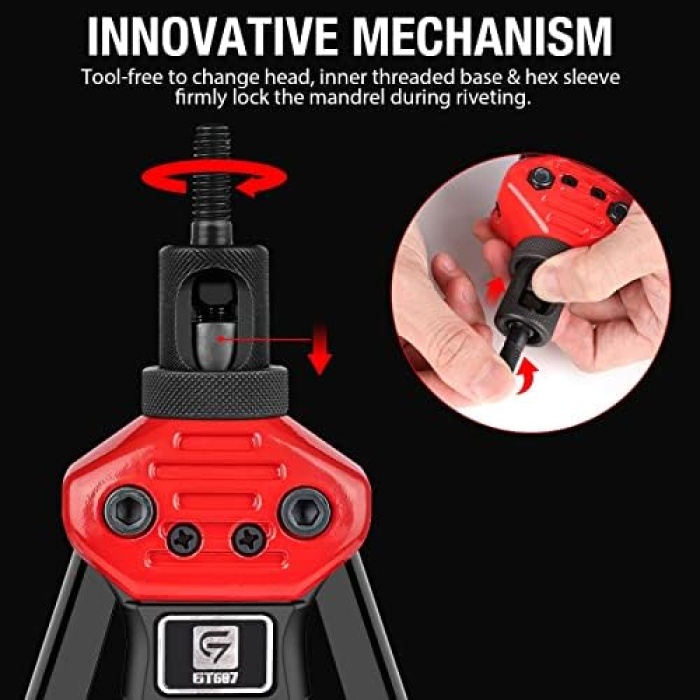 INNOVATIVE MECHANISM – Toolless operation to change head. The Inner threaded base & hex sleeve firmly lock the mandrel during riveting.